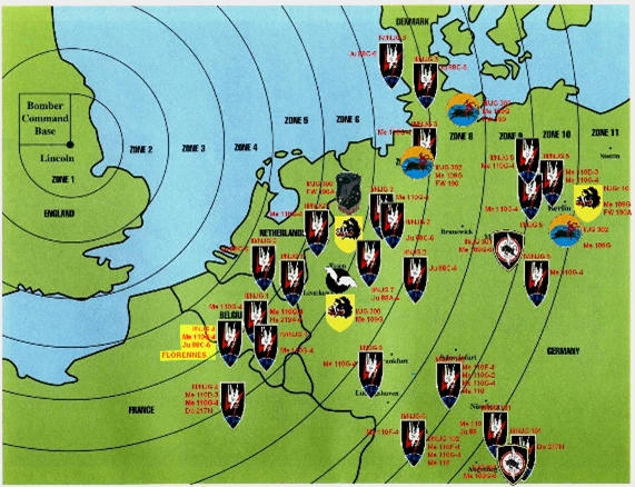 L’aérodrome est officiellement terminé en juin 1943. La base va abriter de 20 à 30 chasseurs bimoteur Messerschmitt Bf110 du 1er Groupe de la 4ème Escadre de chasse de nuit. Des Junkers Ju88, tous avec radar embarqué, remplaceront progressivement tout le groupe. En février 1943, les centaines de bombardiers américains de la 8ème et 9ème Air Force intensifient leur bombardement de jour des villes allemandes. C’est pour cette raison que le 14 novembre 1943 le Gruppe I de la célèbre 26ème Escadre de chasse de jour est détaché à Florennes pour environ 5 mois.  Le groupe est équipé de 30 à 40 Focke Wulf 190.